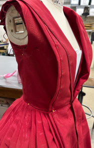 After finishing the construction of an appropriately 1720s corset, I began draping this robe volante with the front panel. Due to the amount of fabric needed, I came to the conclusion that the most efficient way to drape this piece would be in four sections: the underbodice, for support of the mass weight of the gown, the center front panel, the pleated side skirt panels, and the center back panel. The draping process was overall straightforward and involved much pleating which allowed for hidden darts and box pleats to allow for extra shaping where needed. Patterning references include Janet Arnold Patterns of Fashion 1, and Norah Waugh The Cut of Women's Clothes, 1600-1930. The finished dress was made with Moire` Bengaline, and is closed using the traditional method of pinning.